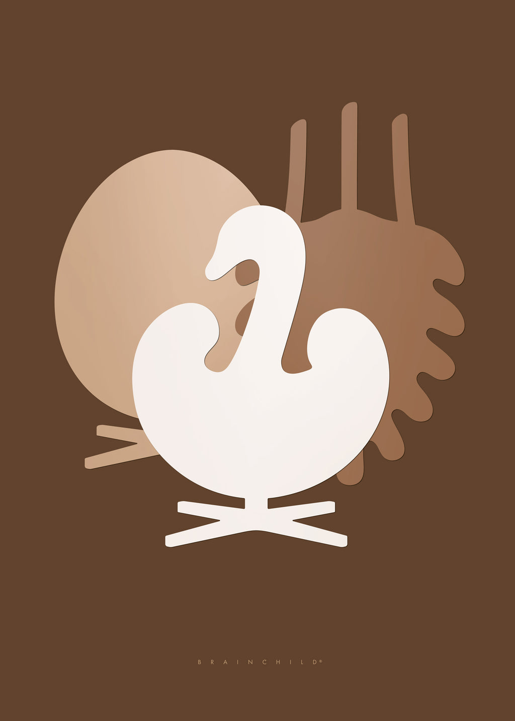 Bring timeless Danish design into your home with Brainchild’s poster featuring Design Icons on an elegant brown background, creating a visual symphony of our most popular designs: The Egg, The Pine Cone, and The Swan. These iconic designs represent Arne Jacobsen’s armchairs, The Egg and The Swan, designed in 1958, and Poul Henningsen’s 1956 lamp, The Pine Cone. Designed and produced in Denmark using premium materials to ensure lasting quality and timeless elegance.